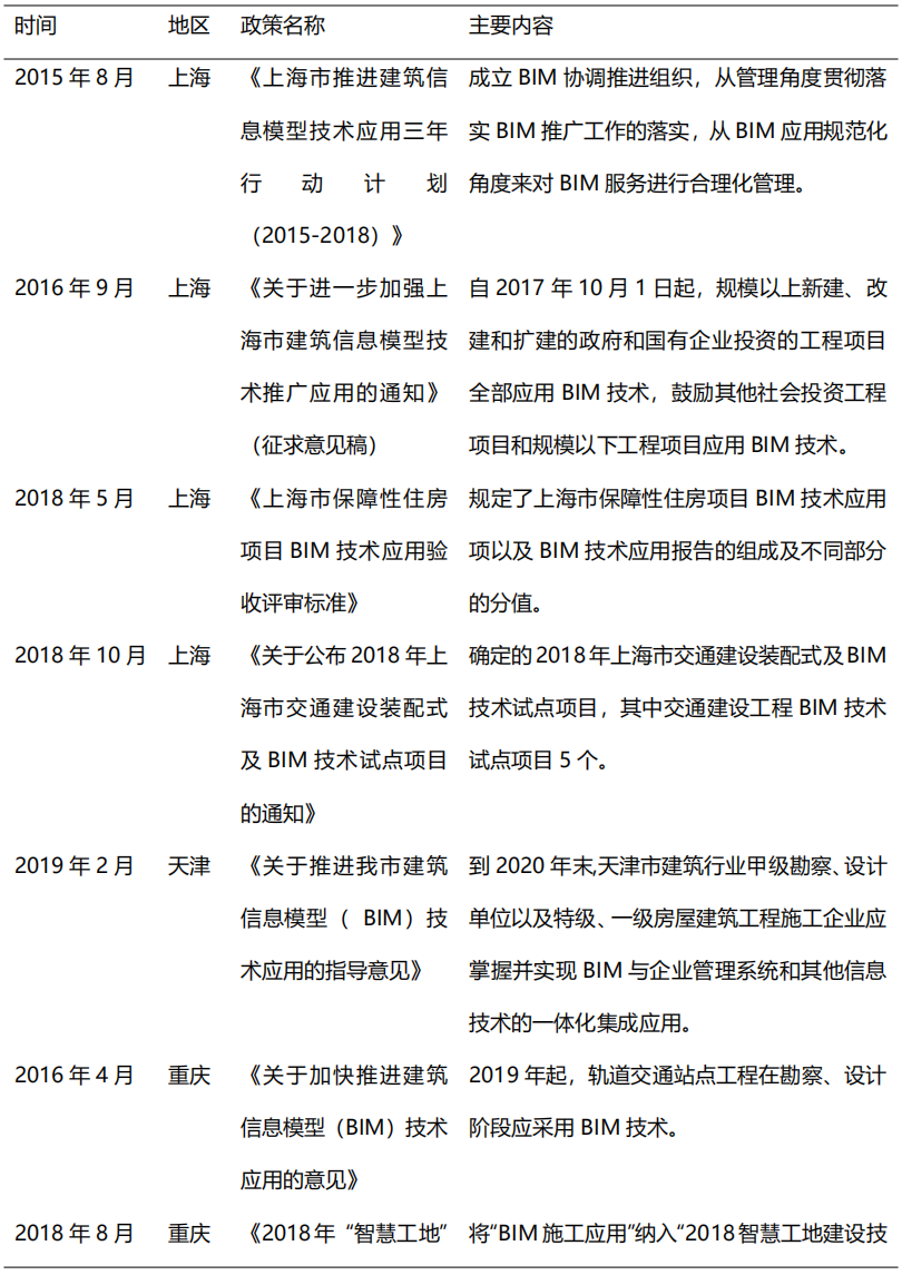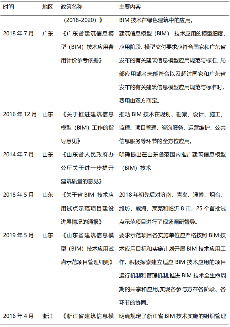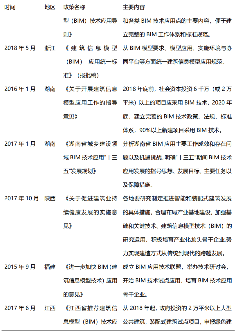 從2014年開始,在住建部的大力推動下,各省市政策相繼出臺BIM推廣應用文件,到目前我國已初步形成BIM技術應用標準和政策體系,為BIM的快速發(fā)展奠定了堅實的基礎。2017年,貴州、江西、河南等省市正式出臺BIM推廣意見,明確提出在省級范圍內提出推廣BIM技術應用。2018-2019年,各地政府對于BIM技術的重視程度不減,重慶、北京、吉林、深圳等多地政策出臺指導意見,旨在推動BIM技術進一步應用普及。隨著我國出臺BIM推廣意見的省市數(shù)量逐漸增多,全國BIM技術應用推廣的范圍更加廣泛。表2列舉了部分重要地方鼓勵政策。