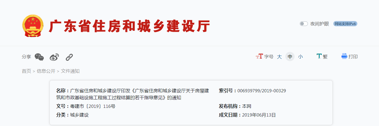 2019年6月13日,廣東省住建廳印發(fā)通知,推進全省房屋建筑和市政基礎設施工程施工過程結算。