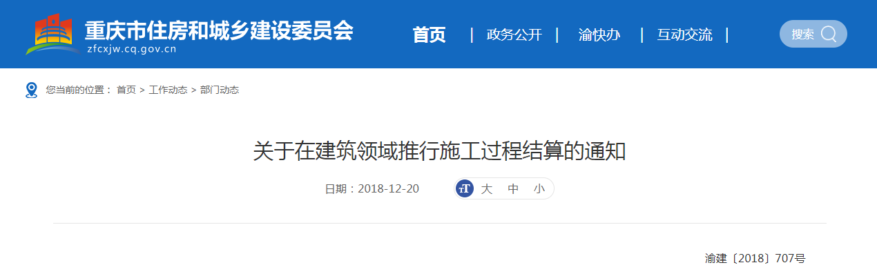 2018年12月20日,重慶市住建委發(fā)布《關于在建筑領域推行施工過程結算的通知》,要求:新開工、建設工期兩年以上工程,推行施工過程結算。