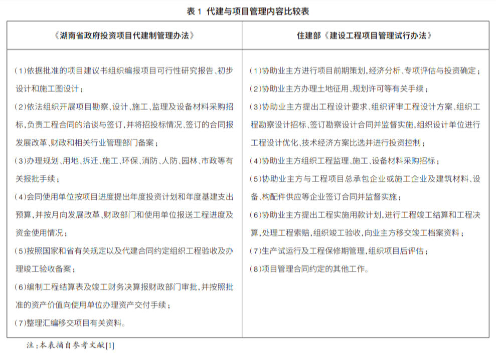 為貫徹2004年國務院發布的《關于投資體制改革的決定》精神,我國非經營性政府投資項目已逐步形成了“政府專業機構代建、政府專業代建公司代建和社會代建單位代建”三種主要模式。2007年,湖南省對社會代建項目作出明確規定,代建服務的業主包含政府職能部門和項目使用方,體現了政府職能部門(發改和財政等部門)對非經營性政府投資項目的監管,而且是可考核的工作。2007年住建部發布的《建設工程項目管理試行辦法》明確了為業主服務的項目管理內容(表1),是以“協助”為主的服務,這在當時為推進我國項目管理發展是必要的。目前,從效果考核的角度看,除了有部分是代理業主履行并可考核的工作外,大多的“協助”工作涉及到與業主的相互配合,服務效果難以考核。不能考核的工作要想得到業主和社會的認可是困難的,這也是截至目前無法出臺全國性的工程項目管理服務酬金標準的原因之一。
