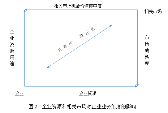 當(dāng)前我國城建領(lǐng)域市場成熟度較低,市場價值集中度不高,比較適合進(jìn)行多元化經(jīng)營。另外,企業(yè)的資源能力也決定了企業(yè)從事某項業(yè)務(wù)所可能實現(xiàn)的價值,企業(yè)在某項業(yè)務(wù)上的資源能力越強(qiáng),說明企業(yè)在這項業(yè)務(wù)上的相對能力就較強(qiáng)。城投公司的多元化維度和規(guī)模主要由這兩種因素決定,如圖2所示: