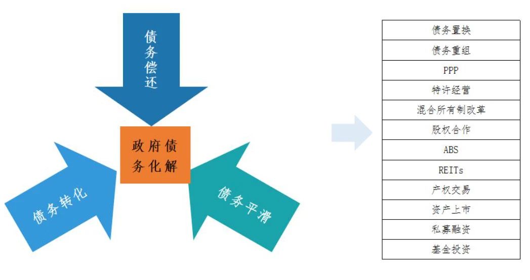 結(jié)合國家相關(guān)政策、學(xué)術(shù)理論以及實踐經(jīng)驗,我們提出了圍繞“債務(wù)平滑、債務(wù)轉(zhuǎn)化、債務(wù)償還”三大策略方向,主要運用“債務(wù)置換、債務(wù)重組、PPP、特許經(jīng)營、混合所有制改革、股權(quán)合作、ABS、REITs、產(chǎn)權(quán)交易、資產(chǎn)上市、私募融資、基金投資”十二種工具,建立明確的債務(wù)化解規(guī)劃,制定分年度債務(wù)化解目標(biāo),切實有效實現(xiàn)政府隱性債的化解,促進(jìn)地方政府投融資運作健康可持續(xù)。