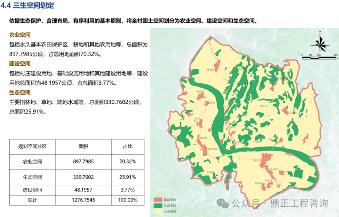 如雙河村結合“田、宅、水、林、產、景”等要素優(yōu)化用地結構,集約土地利用,全要素管控。落實上位空間管控、堅持農業(yè)生態(tài)優(yōu)先、劃定底線保護控制線。依據(jù)生態(tài)保護、合理布局、有序利用的基本原則,將全村國土空間劃分為農業(yè)空間、建設空間和生態(tài)空間,明確生態(tài)保護、農業(yè)生產、村莊建設的主要區(qū)域。同時,對三類空間制定管控要求,強化村莊的底線管控。