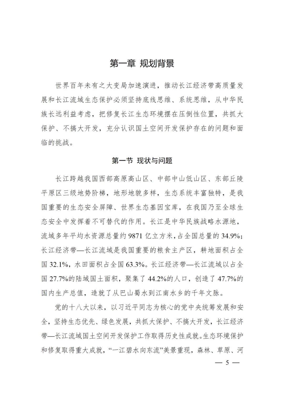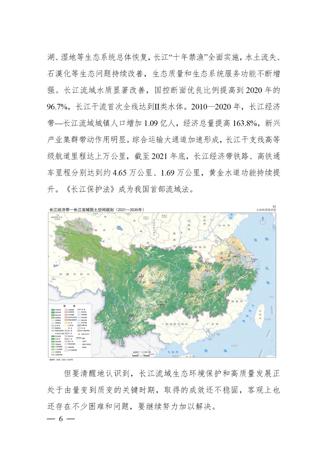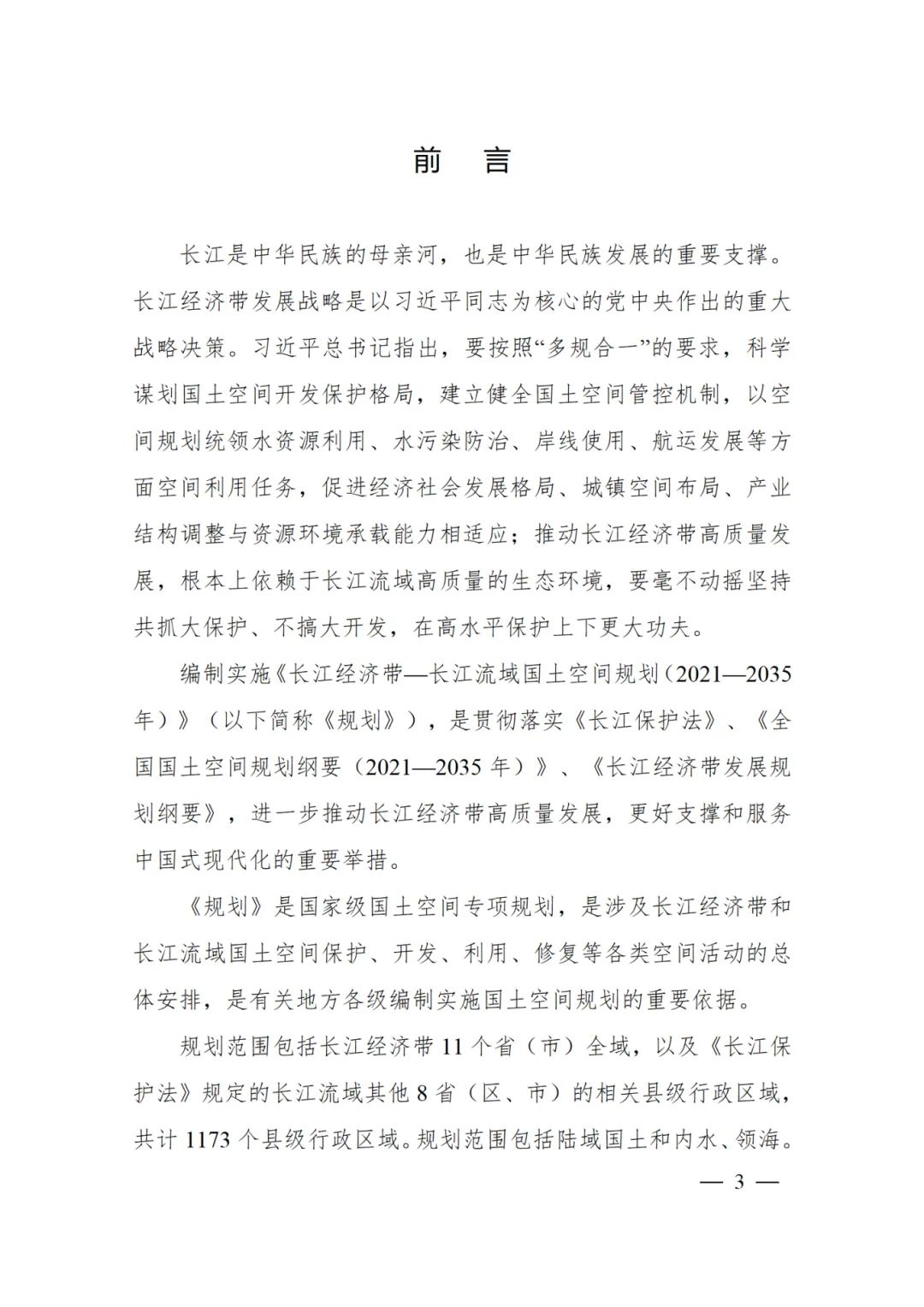 2024年2月9日,《長江經濟帶—長江流域國土空間規劃(2021—2035年)》經國務院批復同意。9月10日,自然資源部正式印發《長江經濟帶—長江流域國土空間規劃(2021—2035年)》。規劃范圍包括長江經濟帶11個省(市)全域,以及《長江保護法》規定的長江流域其他8?。▍^、市)的相關縣級行政區域,共計1173個縣級行政區域。規劃范圍包括陸域國土和內水、領海。其中,陸域面積240萬平方公里。(后附規劃范圍詳細表格)規劃期限為2021年至2035年。