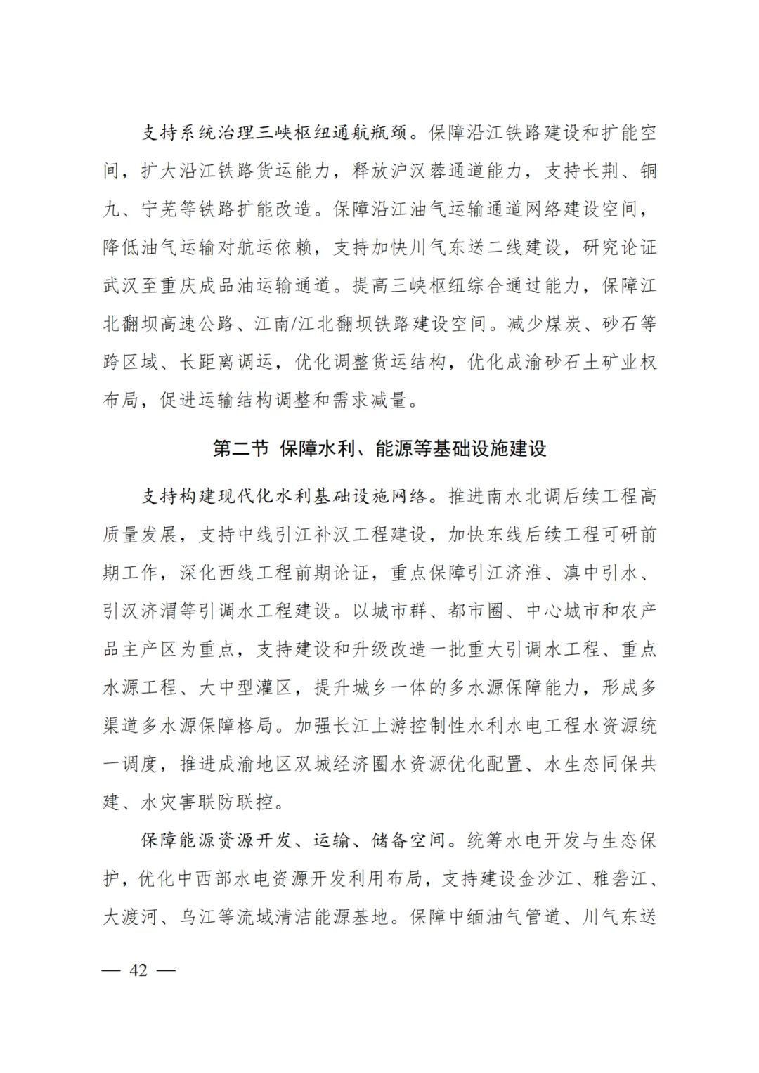 保障中緬油氣管道、川氣東送二線油氣管道、哈密至重慶特高壓通道、金沙江上游外送特高壓輸電通道、川渝特高壓交流工程、白鶴灘至華東特高壓輸電通道等能源輸送通道空間,強化對城市群、都市圈能源供給。