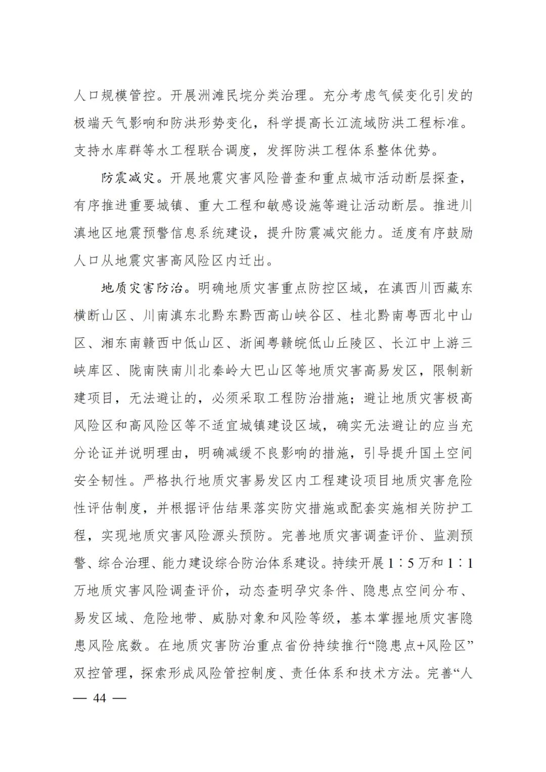 地質災害防治 明確地質災害重點防控區域,在滇西川西藏東橫斷山區、川南滇東北黔東黔西高山峽谷區、桂北黔南粵西北中山區、湘東南贛西中低山區、浙閩粵贛皖低山丘陵區、長江中上游三峽庫區、隴南陜南川北秦嶺大巴山區等地質災害高易發區,限制新建項目,無法避讓的,必須采取工程防治措施;避讓地質災害極高風險區和高風險區等不適宜城鎮建設區域,確實無法避讓的應當充分論證并說明理由,明確減緩不良影響的措施,引導提升國土空間安全韌性。