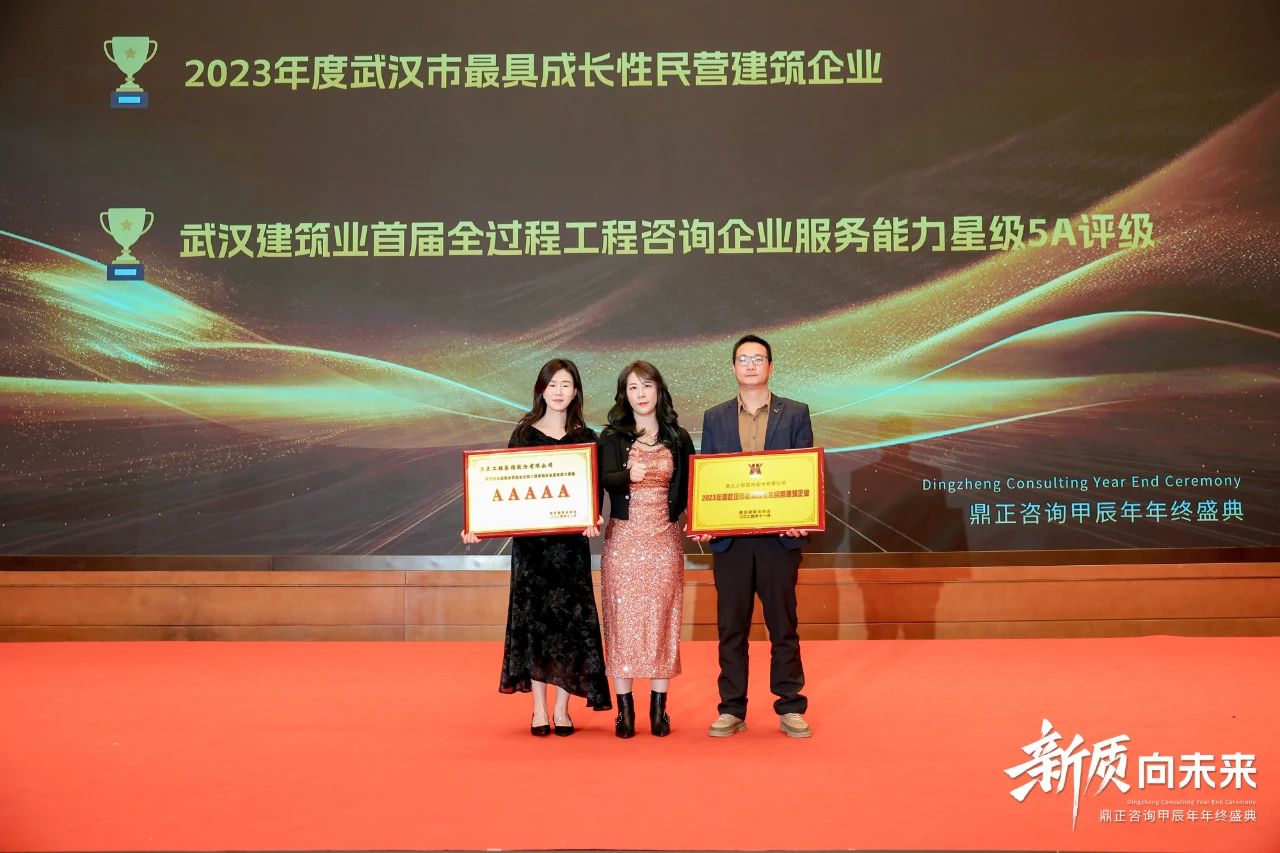 在過去的一年里,鼎正在專家輔助人、專項債、超長期特別國債、中央預(yù)算內(nèi)資金、全過程工程咨詢等業(yè)務(wù)板塊中,展現(xiàn)出強勁的創(chuàng)新力,并獲得行業(yè)廣泛的認可。當晚,武漢建筑業(yè)協(xié)會領(lǐng)導(dǎo)代表、全咨分會秘書長陳金琳女士,為我們頒發(fā)了2023年度武漢市最具成長性民營建筑企業(yè)、武漢建筑業(yè)首屆全過程工程咨詢企業(yè)服務(wù)能力星級5A評級兩項榮譽。