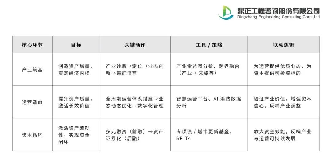 城市更新的本質(zhì)是“產(chǎn)業(yè)價(jià)值發(fā)現(xiàn) — 運(yùn)營(yíng)價(jià)值提升 — 資本價(jià)值實(shí)現(xiàn)”的過(guò)程。通過(guò)產(chǎn)業(yè)精準(zhǔn)定位創(chuàng)造資產(chǎn)增量,運(yùn)營(yíng)精細(xì)化管理提升資產(chǎn)質(zhì)量,資本工具創(chuàng)新激活資產(chǎn)流動(dòng)性,最終形成“產(chǎn)業(yè)筑基 — 運(yùn)營(yíng)造血 — 資本循環(huán)”的可持續(xù)生態(tài),推動(dòng)城市從“空間更新”邁向“價(jià)值再生”。