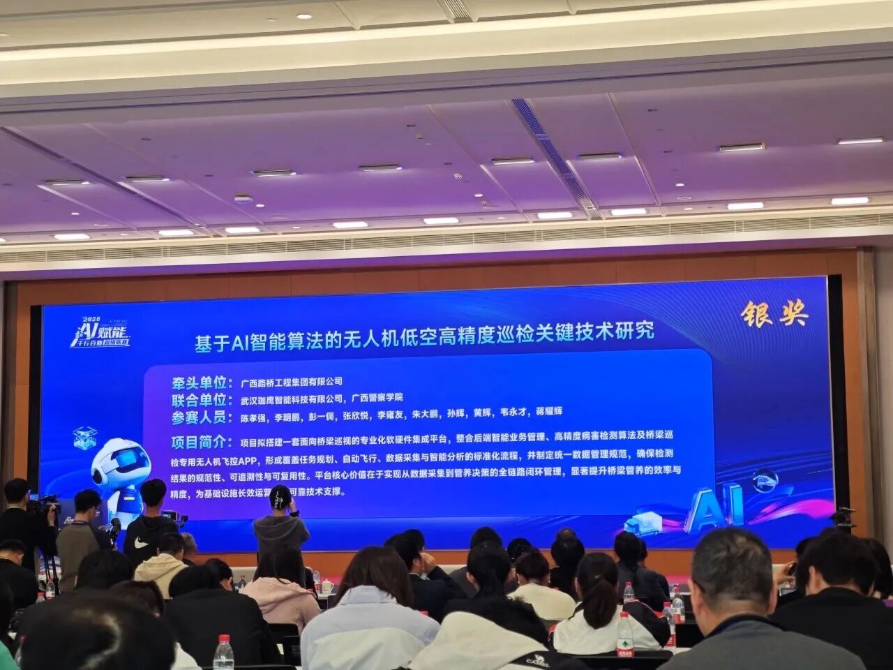 近日,2025年“AI賦能千行百業超級聯賽”交通行業創新大賽在南寧開賽。鼎正參股企業武漢珈鷹智能科技有限公司與廣西路橋工程集團有限公司聯合組隊參賽,以綜合評分位列前三的優異成績,榮獲2025年“AI賦能千行百業超級聯賽”交通行業創新大賽銀獎。
