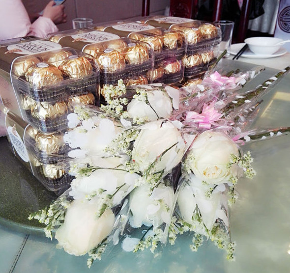 男神們?yōu)榕駛儷I上鮮花和禮物