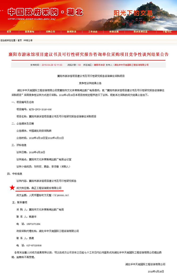 【經(jīng)營成果】我司中標(biāo)襄陽市游泳館項目建議書及可行性研究報告咨詢單位采購項目