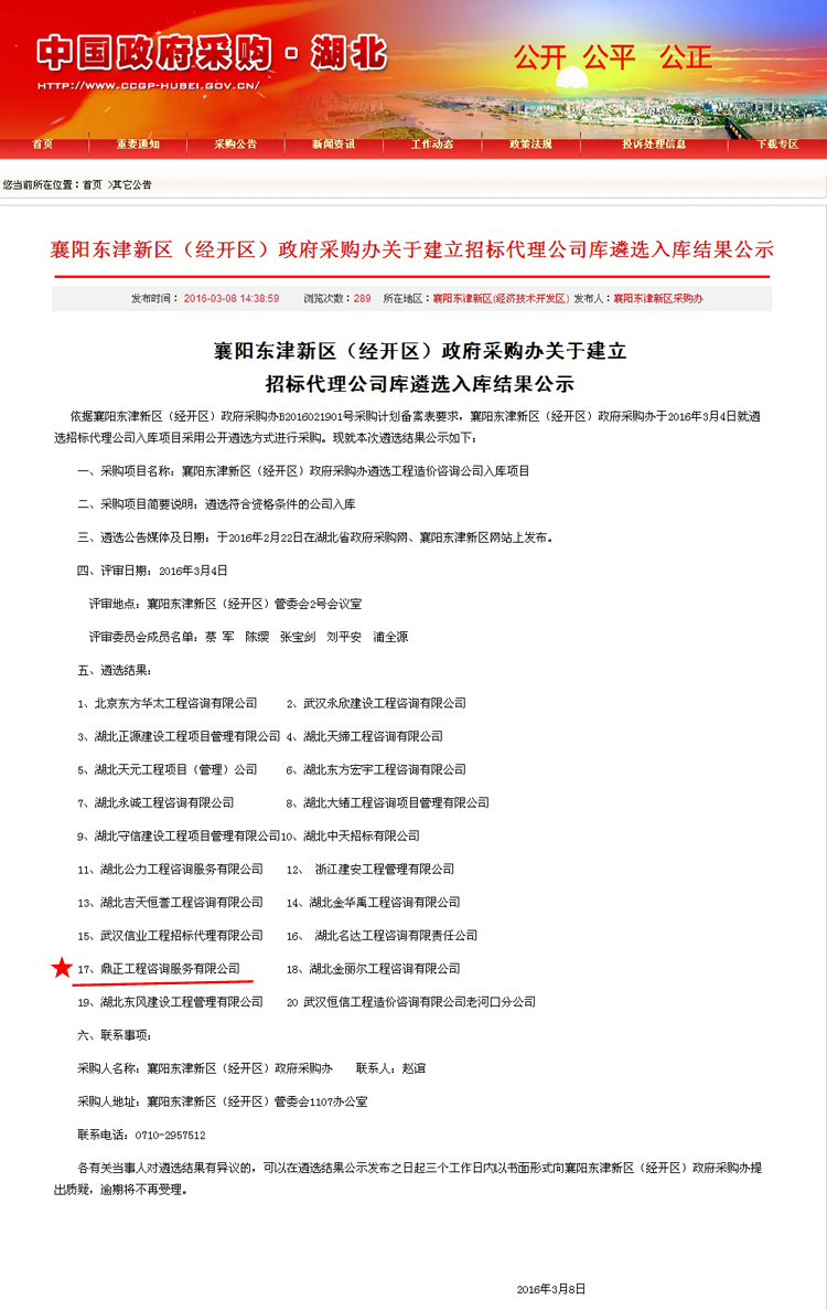 【經營成果】我司入圍襄陽東津新區(經開區)政府采購辦招標代理公司庫